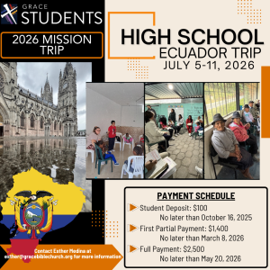 Fall Retreat will be here before you know it! Sign ups are now open!! All students are invited to join us for a weekend of no-tech, full of Jesus, small group discussions, and some fun adventuring! Sign ups close on October 19th. | Middle School! We’re heading to mFuge in St. Louis, Missouri next summer! New year, new place! It’ll be a lot of fun serving in a brand new place. Spots are limited, so register soon. | Our registration is OPEN for our 2026 Summer mission trip to Ecuador! This trip is open to all of High School!